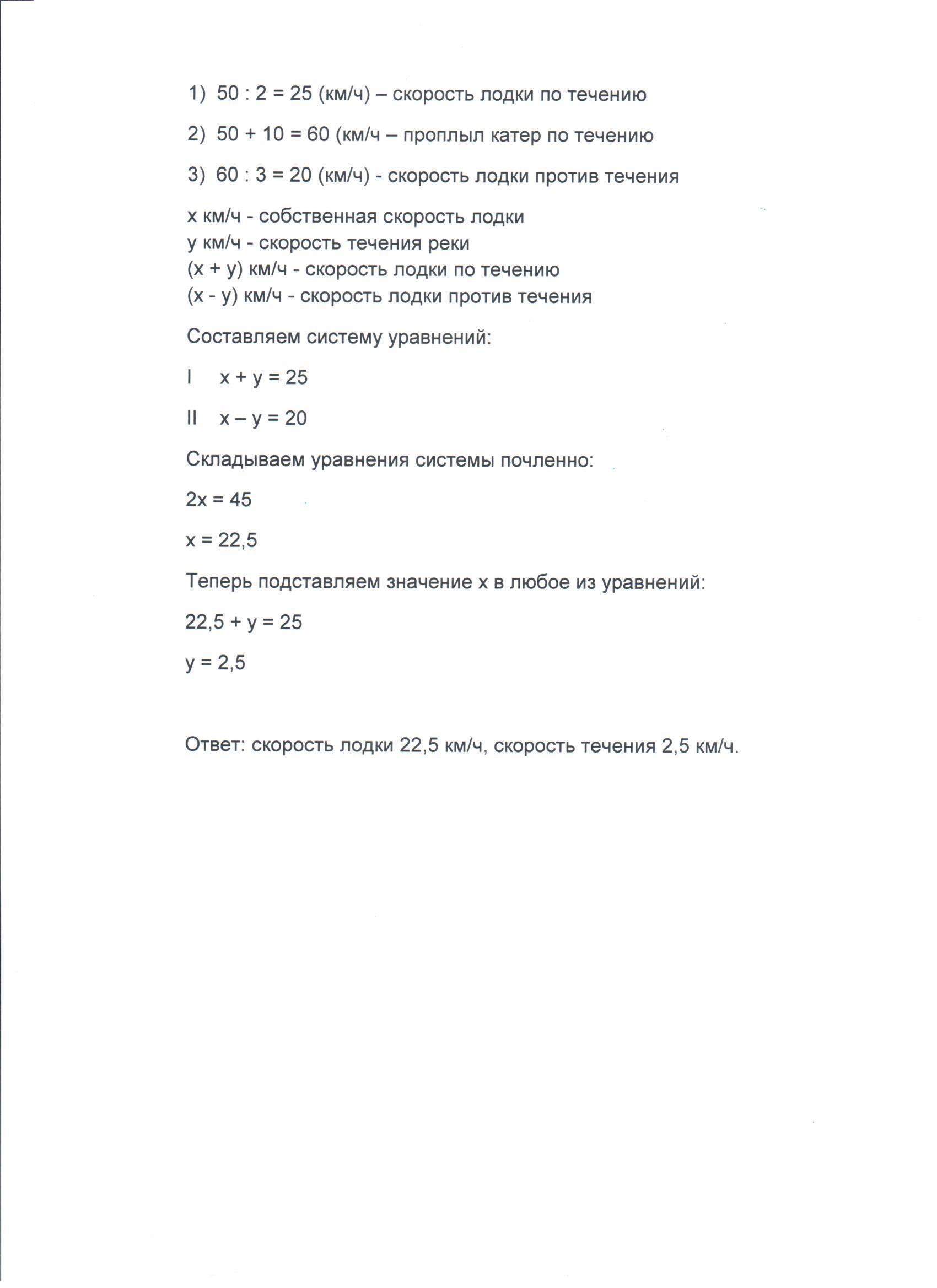 Составе систему уравнения с помощью задачи и решить её способом сложения : Катер проплыл по течению 50 км за 2 ч , а против течения - на 10 км больше за 3 ч . Найдите собственную скорость катера и скорость течения