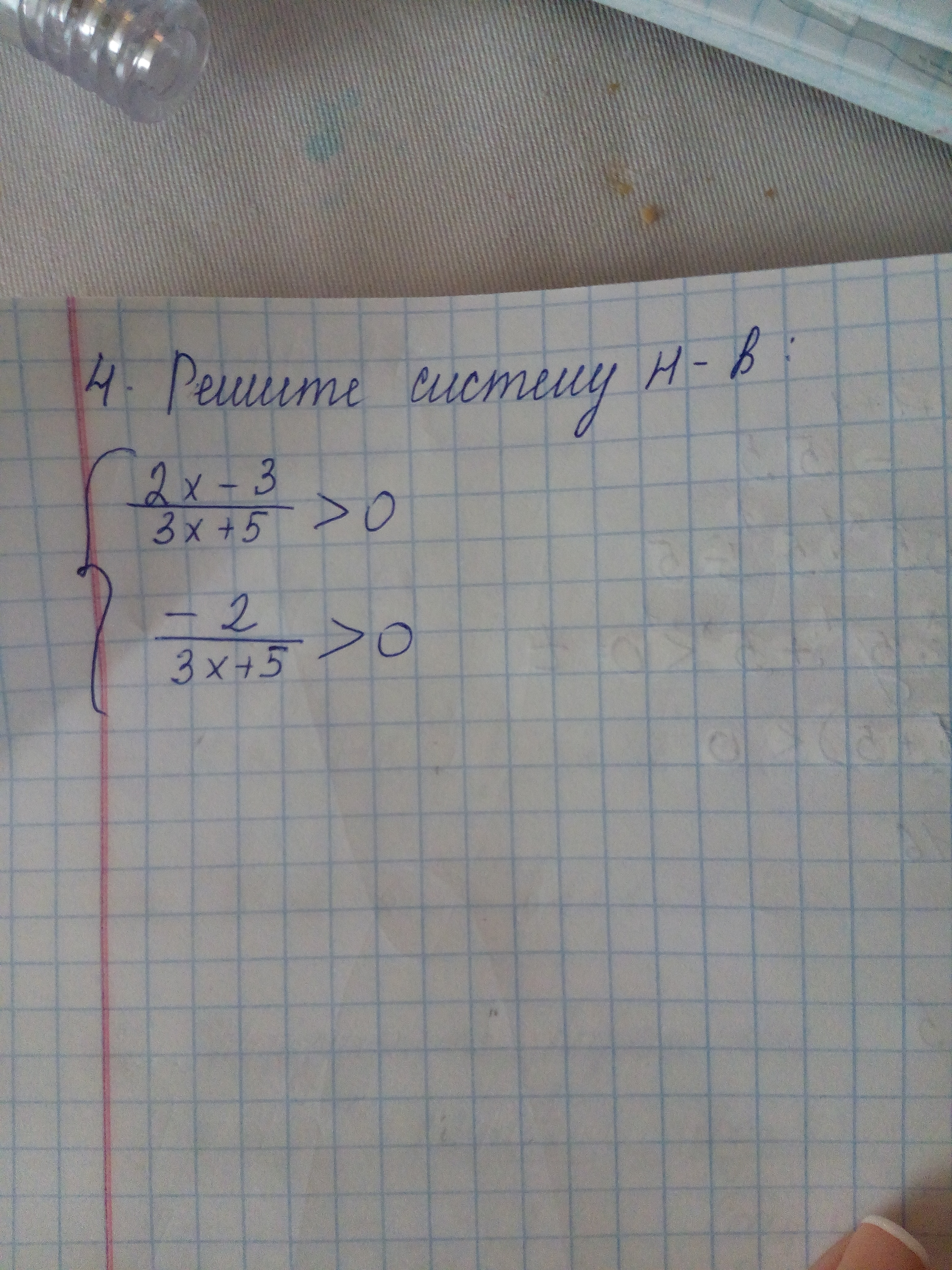зная это, смотрим на 1-е неравенство. в нём знаменатель 3х +5 и он должен < 0, а результат > 0 , значит, 2х -3 должен быть < 0