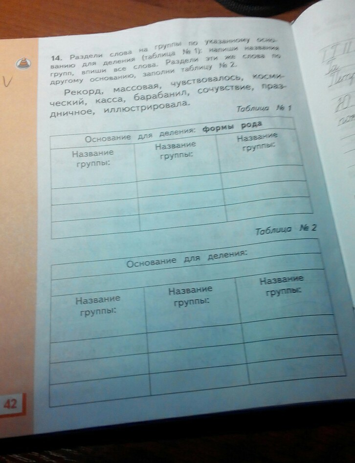 подели слова на группы по указанному основанию для деления таблица номер 1 Запиши названия групп Выпиши все слова раздели эти же слова по другому основанию заполни таблицу номер 2