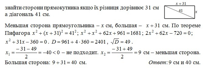 знайти сторони прямокутника якщо їх різниця дорівнює 31 см а діагональ 41 см.