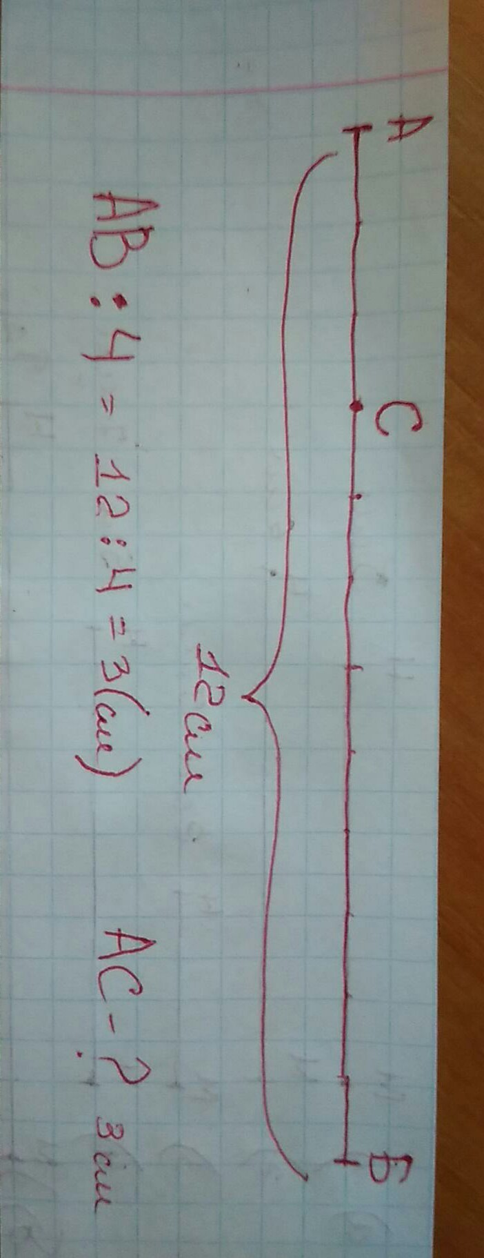 На данном прямой отложили отрезок АБ длиной 12 см. Отметь на нем точку С так, чтобы длина отрезка АС была в 4 раза меньше длины отрезка АБ. Заполни пропуск.