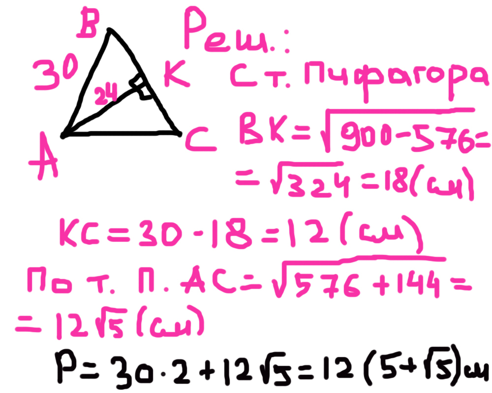 дано: треугольник ABC-равнобедренный. Боковая сторона ВС=30. высота опущенная на боковую сторону =24. Найти Р.