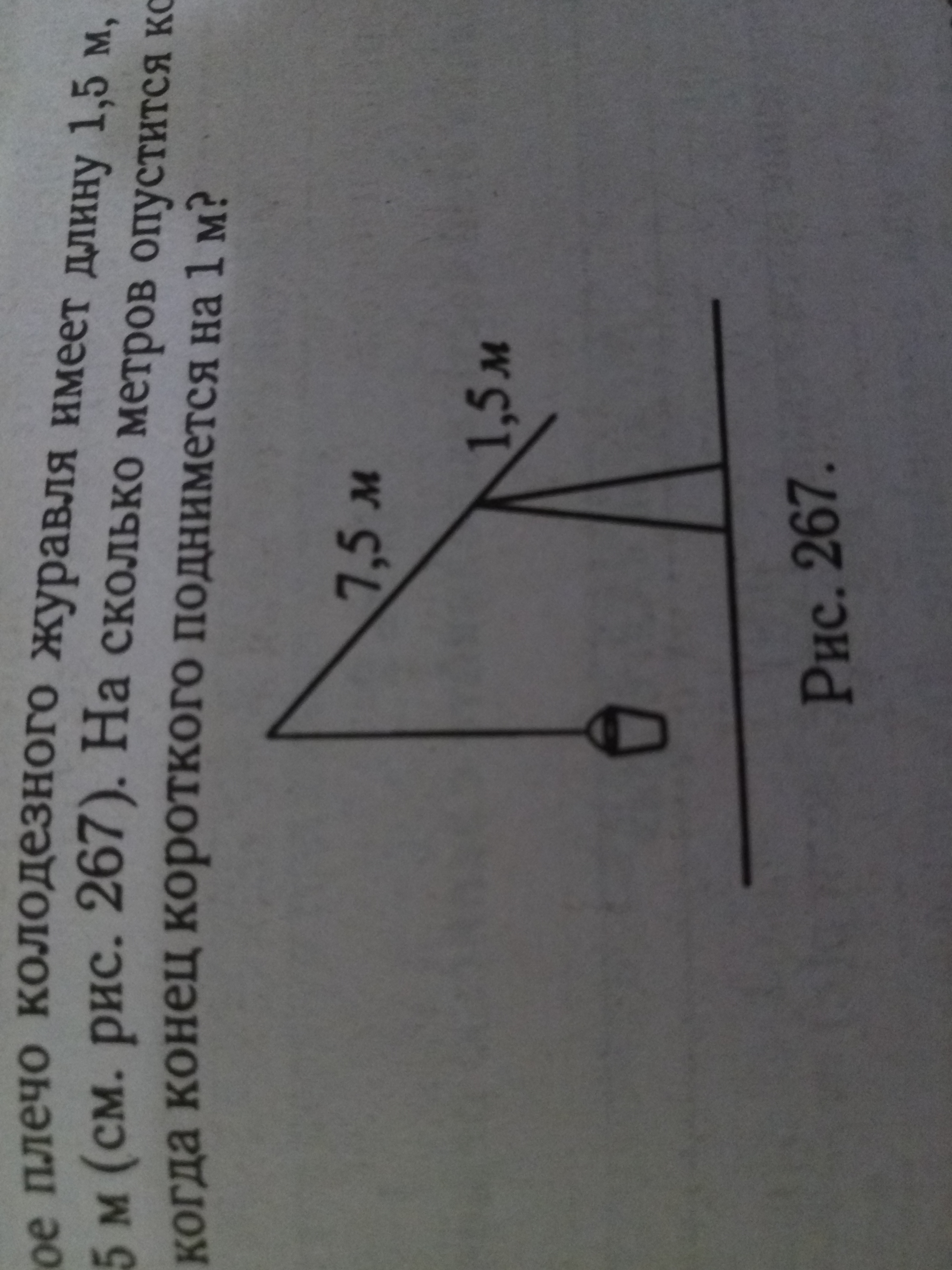 Короткое плечо колодезного журавля имеет длину 1,5м, а длинное плечо-7,5м(см.рис.267). На сколько метров опустится конец длинного плеча, когда конец короткого поднимается на 1м?