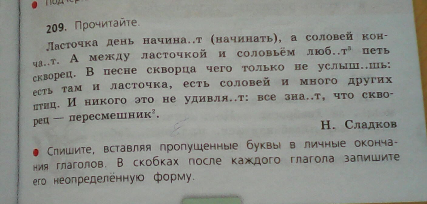 Ласточка день начинает(1 спр), а соловей кончает. А между ласточкой и соловьём любит(2 спр) петь скворец. В песне скворца чего только не услышишь(искл): есть там и ласточка, есть соловей и много других птиц. И никого это не удивляет(1 спр): все знают(1 спр), что скворец - пересмешник.