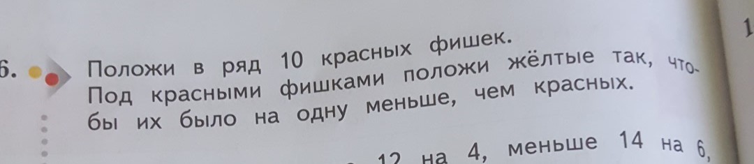 надо положить в ряд 10 красных фишек, но можно просто нарисовать на бумаге 10 красных кружков, а снизу надо нарисовать 9 желтых кружков!