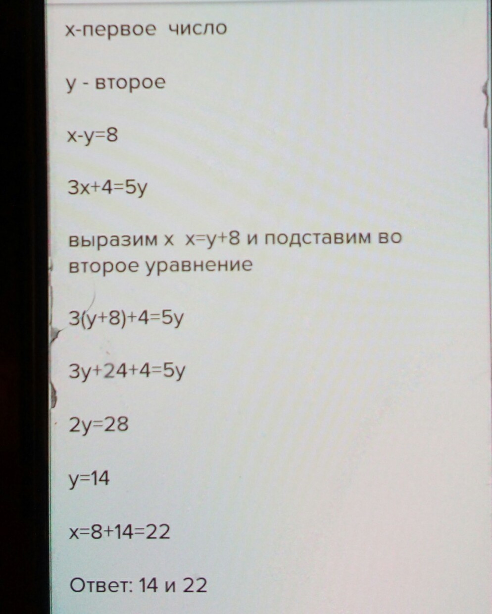ученик задумал два числа разность первого и второго чисел равна 8 утроенное 1 число на 4 меньше чем второй увеличенное в 5 раз какие числа задумал ученик