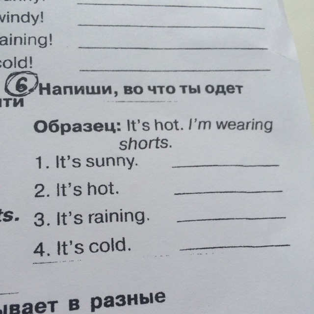 t's sunny. I'm wearing a hat.it's hot. I'm wearing shorts.it's raining I'm wearing a coat.it's cold in wearing a scarf.
