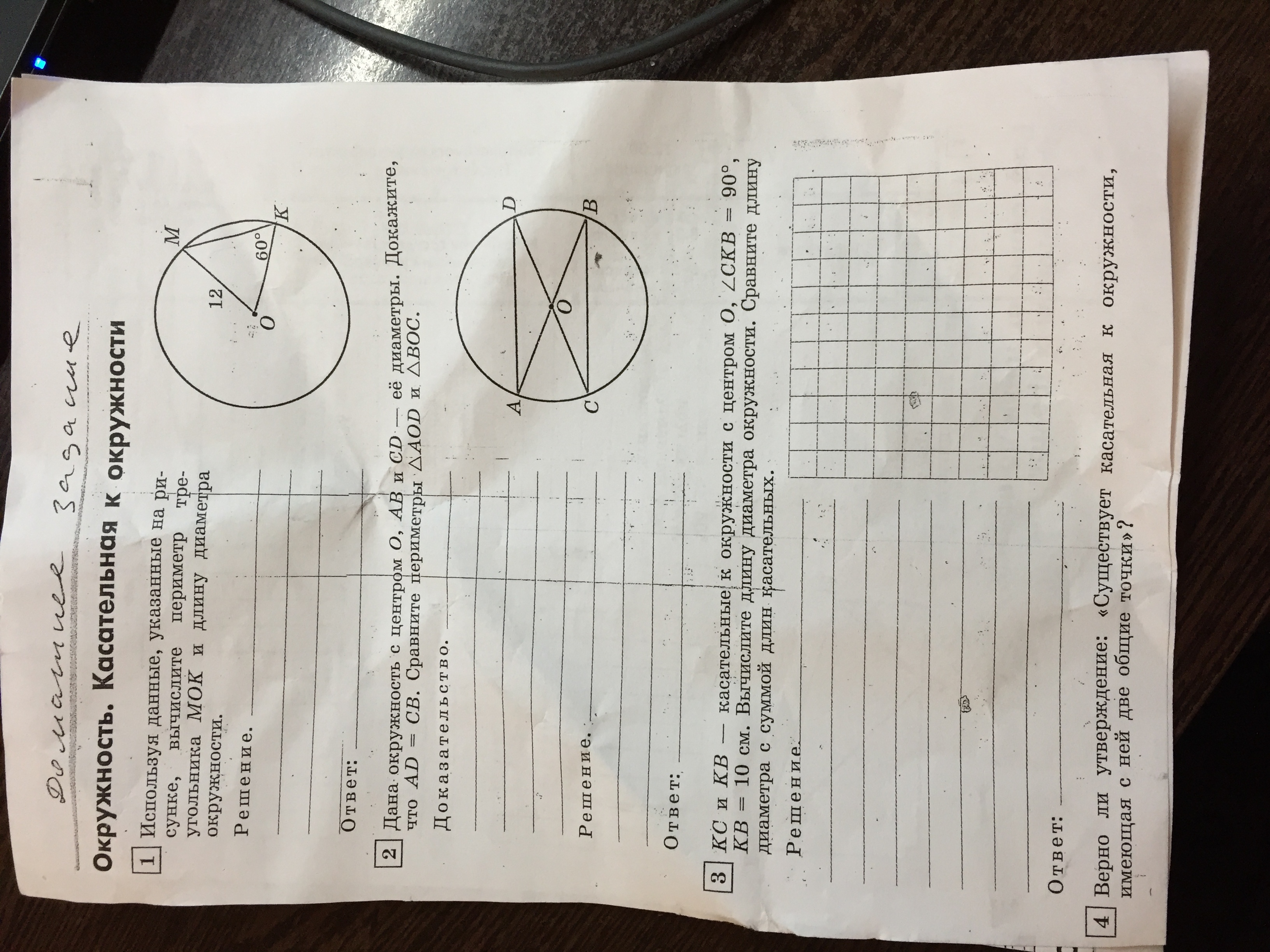 3. радиус всегда перпендикулярен касательной, то есть в четырехугольнике СКВО углы С,К, В равны по 90°, значит и угол СОВ=90°, поэтому четырехугольник СКВО прямоугольник. По теореме о касательных КВ=КС=10, следовательно СКВО- квадрат. значит ОС=10, тогда диаметр равен 20см. Сумма длин касательных и диаметр равены 20.