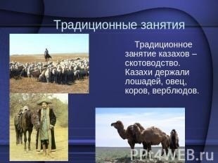 Традиционным занятием казахов является скотоводство кочевого или полукочевого типа. Разводят овец, коз, крупный рогатый скот, коней, верблюдов. Земледелие не было так развито и играло в хозяйстве подспорную роль. С конца 18 века под влиянием русских переселенцев земледелие у казахов получило дальнейшее развитие. Во второй половине 19 века оно уже сопровождалось постепенным переходом на оседлость. Казахи занимались также домашними промыслами, рыболовством и охотой.