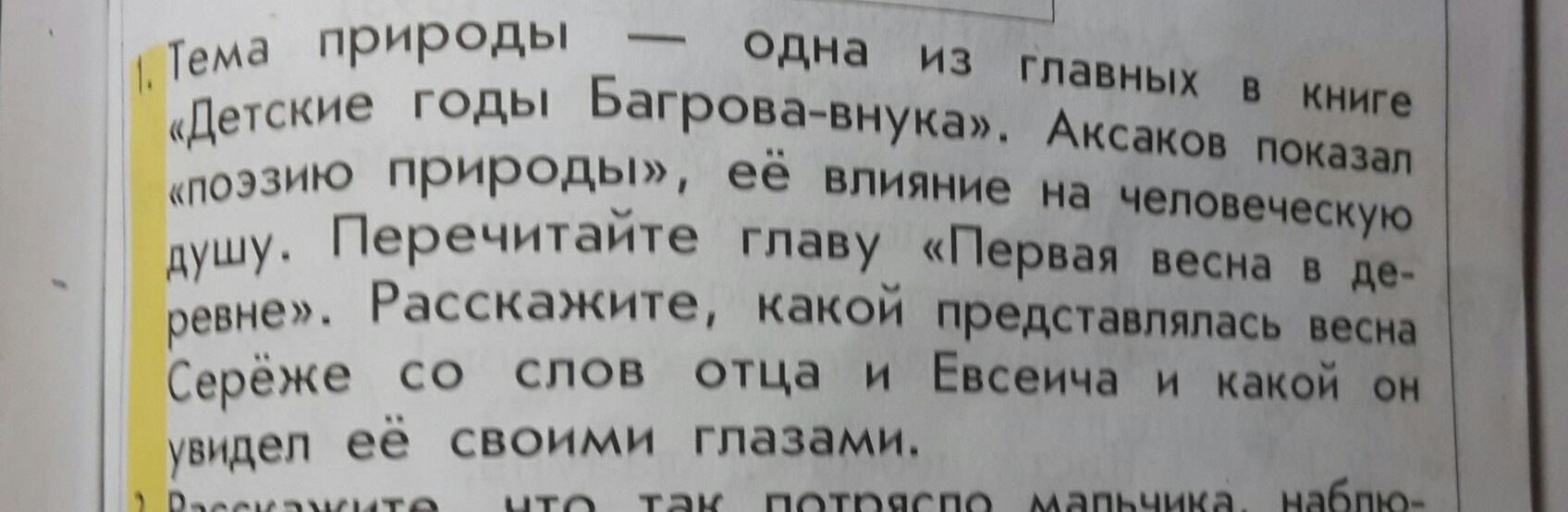 со слов отца и Евсеича :"Находя во мне живое сочувствие, они с увлеченьем предавались удовольствию рассказывать мне: как сначала обтают горы, как побегут с них ручьи, как спустят пруд, разольется полая вода, пойдет вверх по полоям рыба, как начнут ловить ее вятелями и мордами; как прилетит летняя птица, запоют жаворонки, проснутся сурки и начнут свистать, сидя на задних лапках по своим сурчинам; как зазеленеют луга, оденется лес, кусты и зальются, защелкают в них соловьи… "