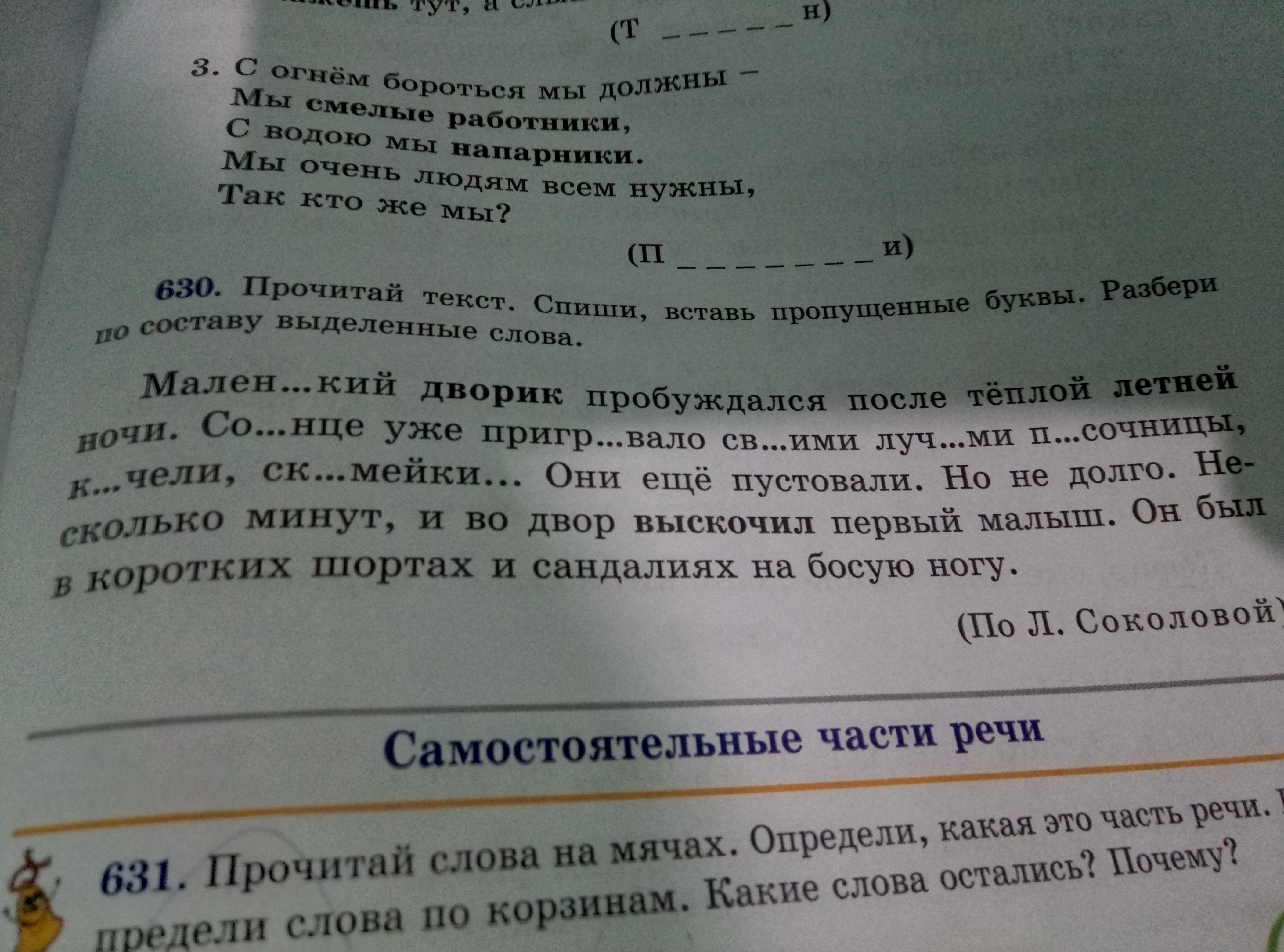 маленький маленьк корень ий окончание , дворик двор корень ик суффикс летней лет корень н суффикс ей окончание,выскочил вы приставка скоч корень ил суффикс нулевое окончание во всех слова основа слова до окончания!!