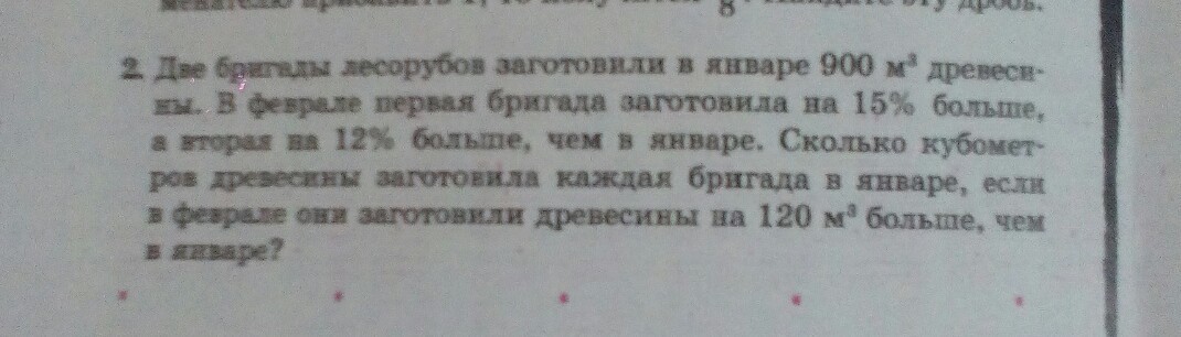Х кубов заготовила в январе 1-я бригада, Y кубов заготовила в январе вторая бригада. Отсюда имеем первое уравнение X+Y=900. Из условия задачи в феврале они заготовили 1,15Х+1,12Y=1020. Решаем систему уравнений методом подстановки.