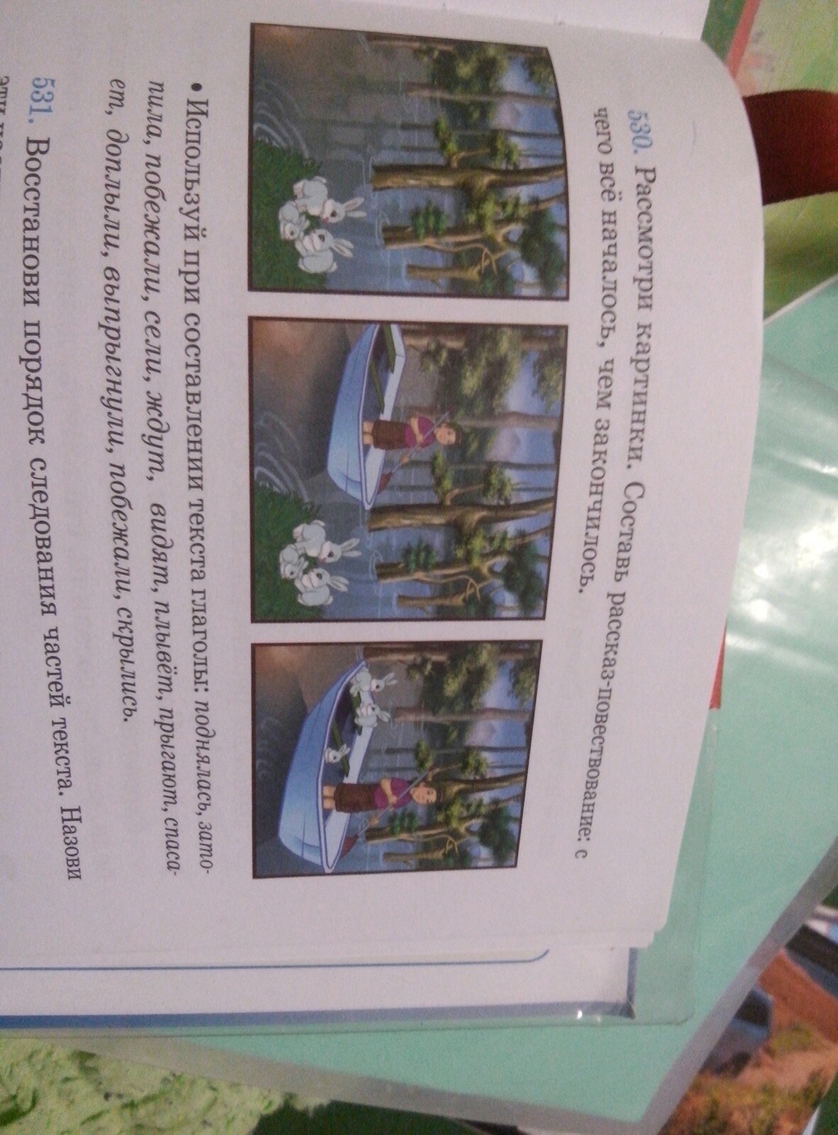 Однажды резко поднялась вода из реки. И затопила вокруг всю поляну. Побежали зайчата на островок, сели и ждут помощи. Вдруг видят плывет мальчик на лодке. Как только лодка поравнялась с ними, они запрыгнули в неё. Мальчик спас зайчат от гибели. Доплыли они до суши и тут же спасённые, выпрыгнули из лодки, побежали и скрылись.