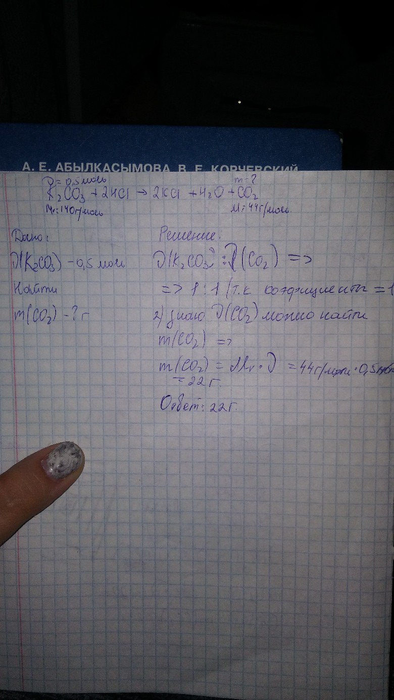 Помогите плиззз Определите массу оксида углерода (IV) полученнного при ваимодействии 0,5 моль карбоната калия с соляной кислотой