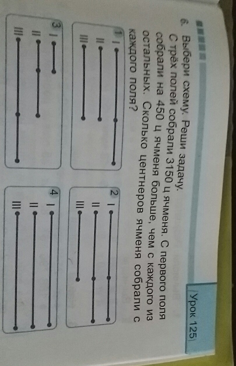 первый рисунок. Пусть со 2 и 3 полей собрали хц ячменя, тогда с первого х+450ц. получаеться такое уравнение: 2х + 450 + х= 3150; 3х+450=3150; 3х=2700; х=900. Тогда с 1 и 2 поля собрали по 900ц ячменя, а с 3 получаеться 450+900=1350ц.