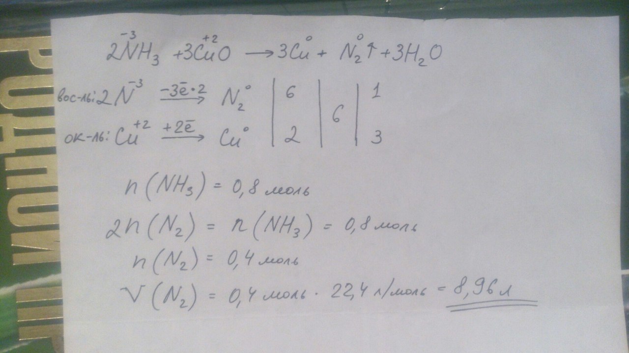 Составьте уравнение химической реакции с помощью метода электронного баланса: NН3 + СuО = Сu + N2 ↑ + Н2О