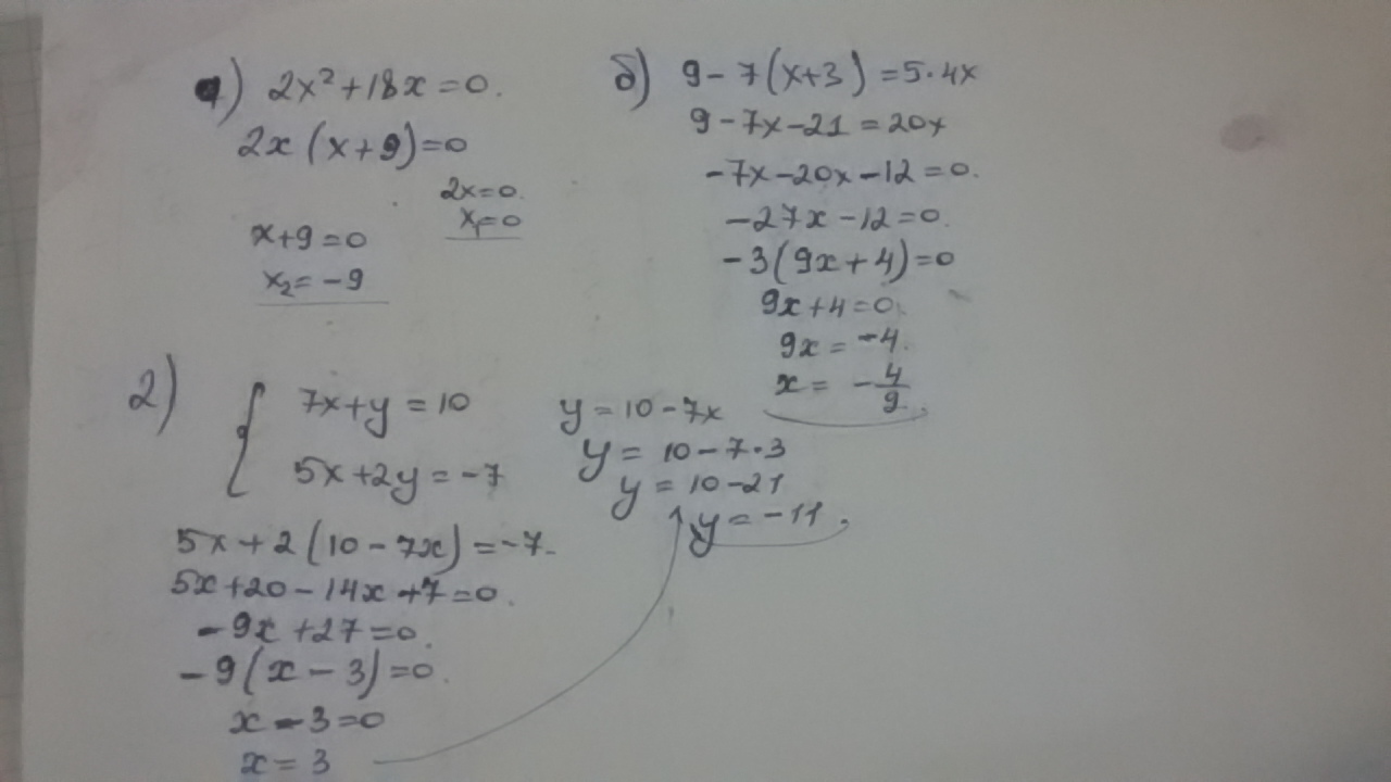 a)2x²+18x=0 b)9-7(x+3)=5*4x