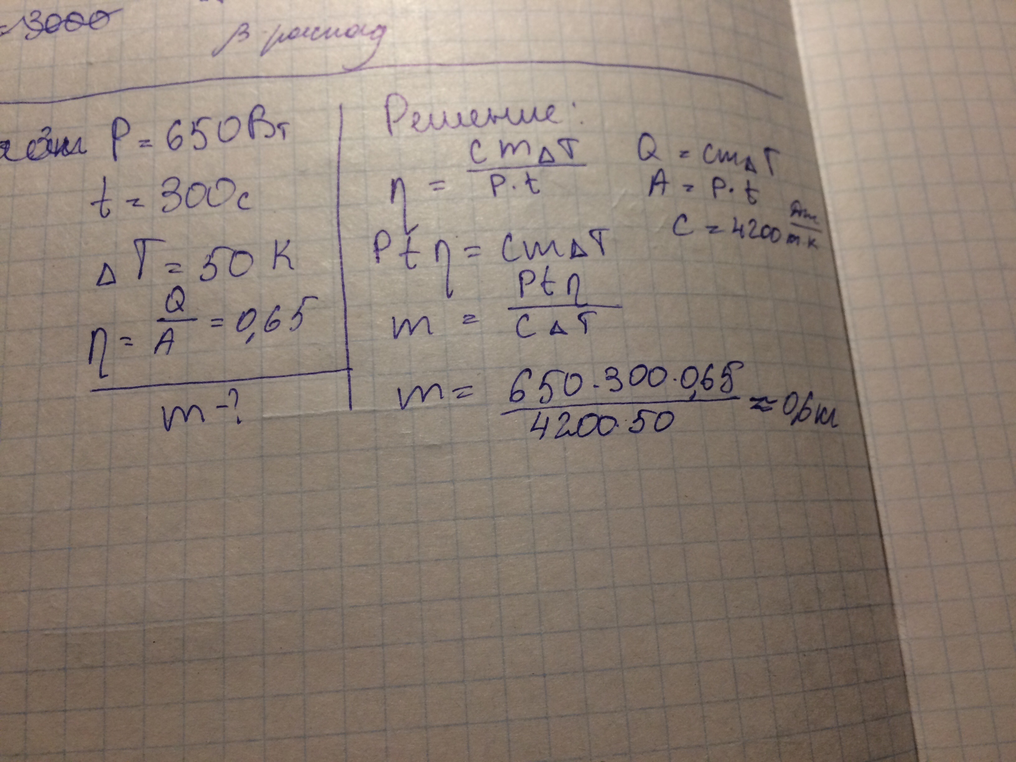 В электрическом чайнике мощностью 0,65 кВт вода массой * за время 5 минут нагревается на 50 градусов. ( вода не кипит .) Коэффициент полезного действия,определяемый как отношение количества теплоты , затраченной на нагрев воды за некоторое время, к работе тока за это же время, составляет 65%. определите значение величины, обозначенной *.