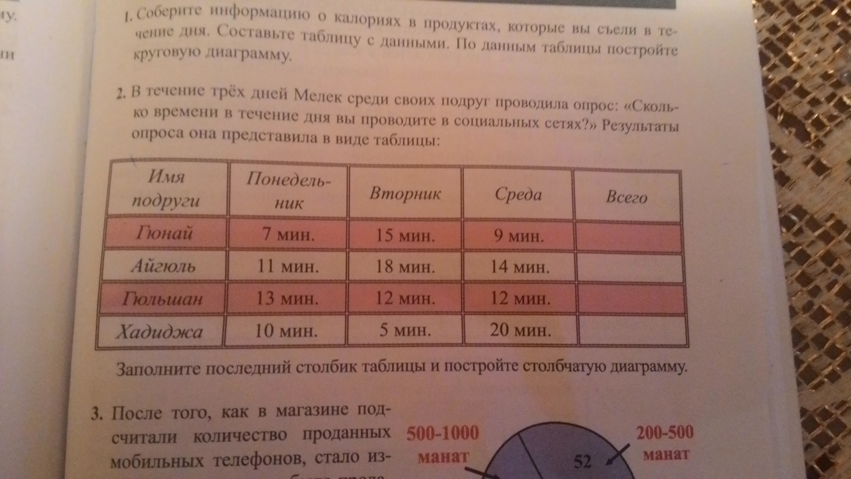 Начнем с Гюнай. Нужно сложить все дни недели которые нам даны и записать в последний столбик таблицы.Чтобы узнать сколько всего времени каждая из девочек провели в соц.сетях нужно сложить всё время.