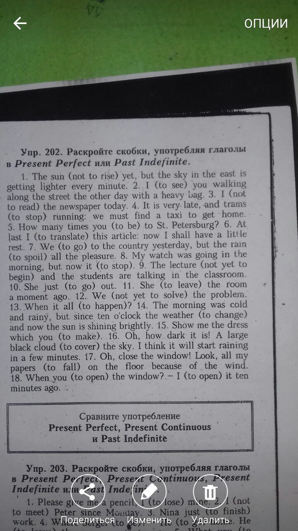 I. She has just gone. 2. She left. 3. We have not yet solved. 4. When did it all happen. 5. The weather has changed. 6. You have made. 7. A large black cloud has covered. 8. All my papers have fallen. 9. When did you open, I opened. I0. The sun has not risen. II. I saw. I2. I have not read. I3. Trams have stopped. I4. How many times have you been. I5. I have translated. I6. We went, the rain spoilt. I7. It has stopped. I8. The lecture has not yet begun.
