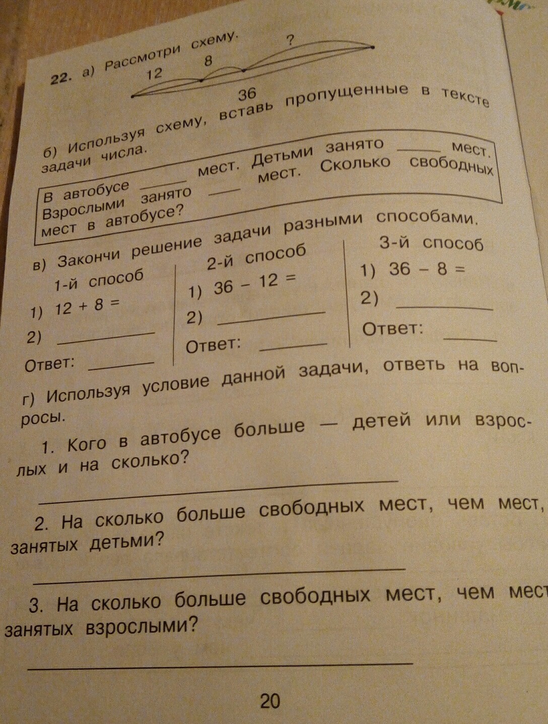 В автобусе 36 мест. Детьми занято 12 мест. Взрослыми занято 8 мест. Сколько свободных мест в автобусе?