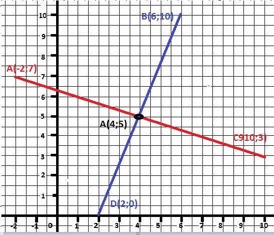 На координатной плоскости отметьте точки A(-2;7),B(6;10),C(10;3) и D(2;0).Найдите пересечение AC и BD.