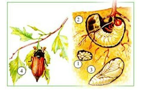 Определите какой тип развития характерен для майского жука. Какие этапы развития обозначены цифрами 1-4.