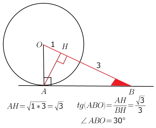 На прямой, касающейся в точке A окружности с центром O, отмечена точка B, и из точки A проведен перпендикуляр AH к прямой OB. найдите угол ABO, если BH=3 см и HO=1 см. Помогите пожалуйста, заранее спасибо!!!