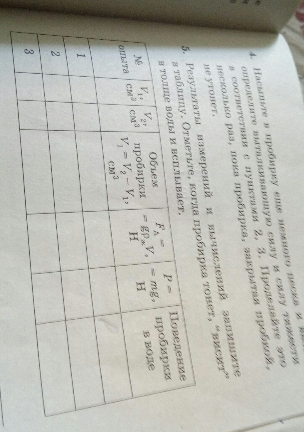 результаты измерений и вычислений запишите в таблицу отметьте Когда Пробирка тонет висит а толку ещё воды и всплывает