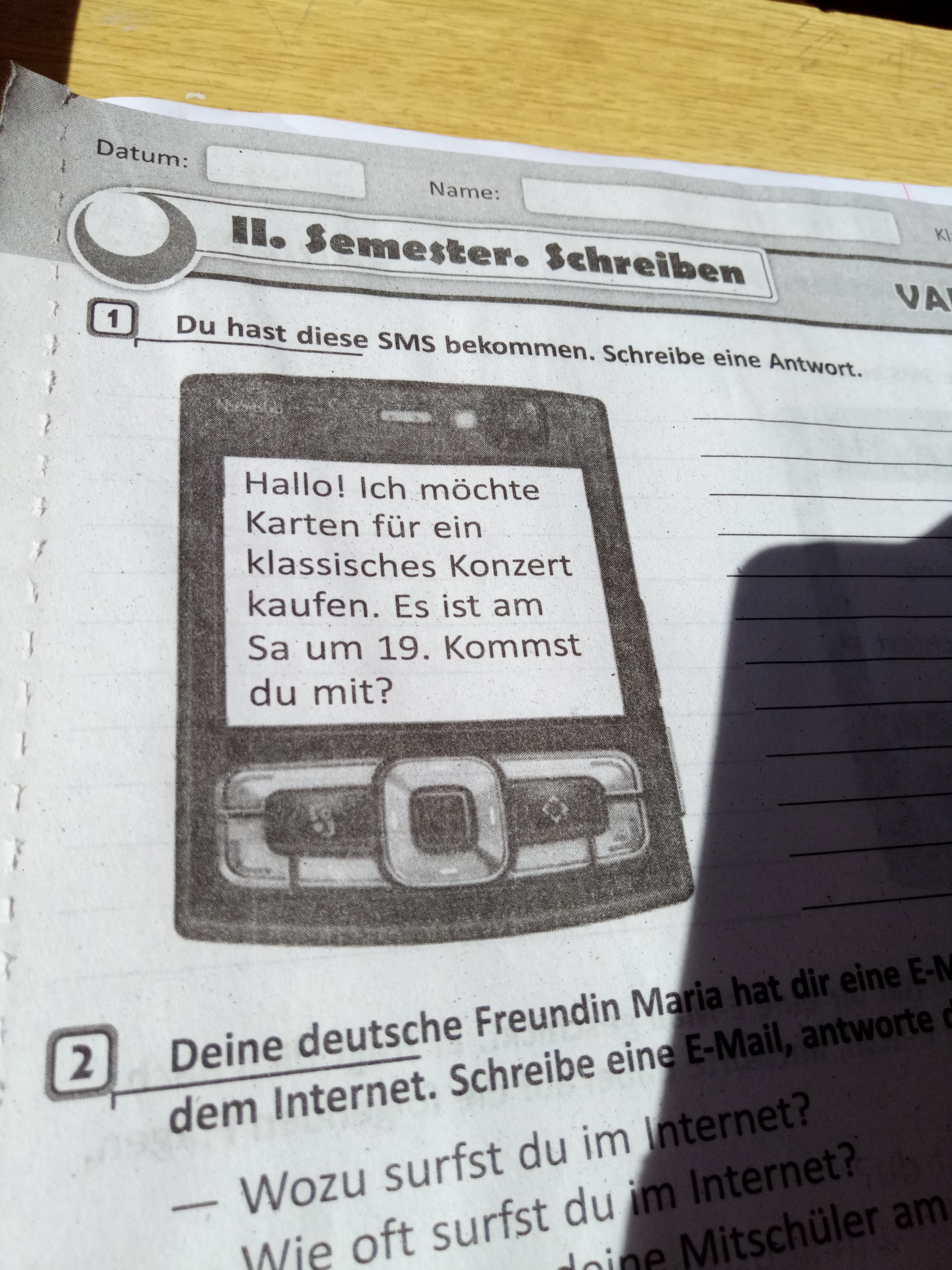 2) Hallo. Dein Vorschlag ist seht gut. Aber ich habe keine Zeit. Am Samstag habe ich die Gäste.
