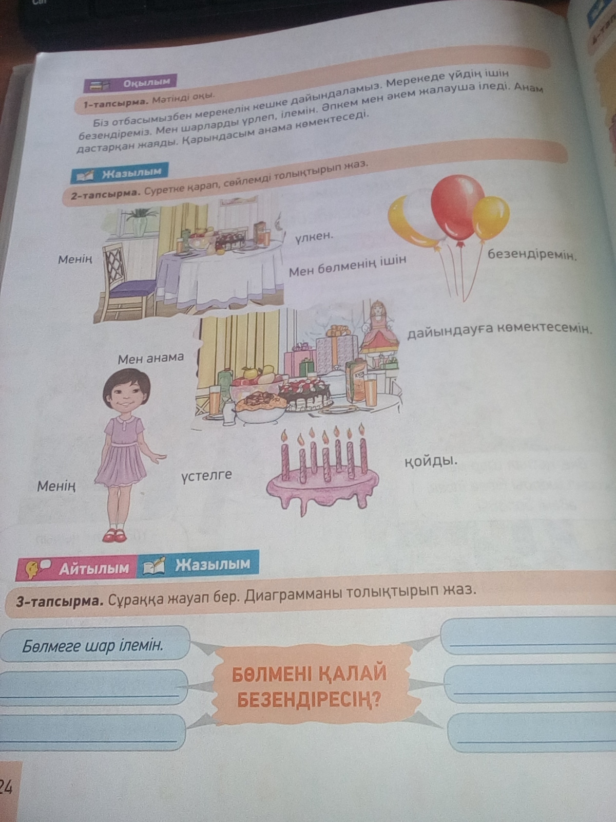 Менің бөлмем үлкен Мен бөлменің ішін шармен безендіремін Мен анама дастархан дайындауға көментесемін Менің анам үстелге торт қойды