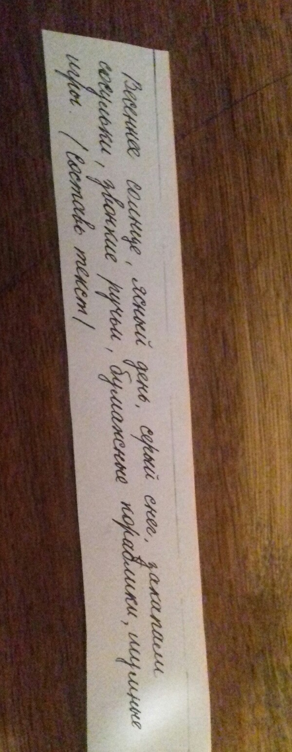 Сегодня было весенние солнце и ясный день!Серый снег уже почти сошел,закапали сосульки.Ребятишки услышали звонкие ручьи и стали делать бумажные кораблики!И закатили такие шумные игры с этими корабликами что было слышно на всю деревню!
