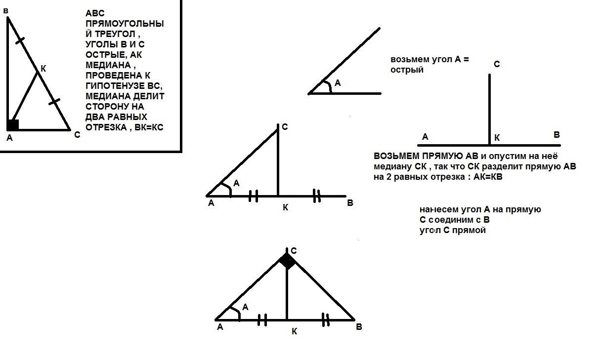 Построить прямоугольный треугольник по острому углу и медиане, проведенной к гипотенузе. Помогите быстрее пожалуйста