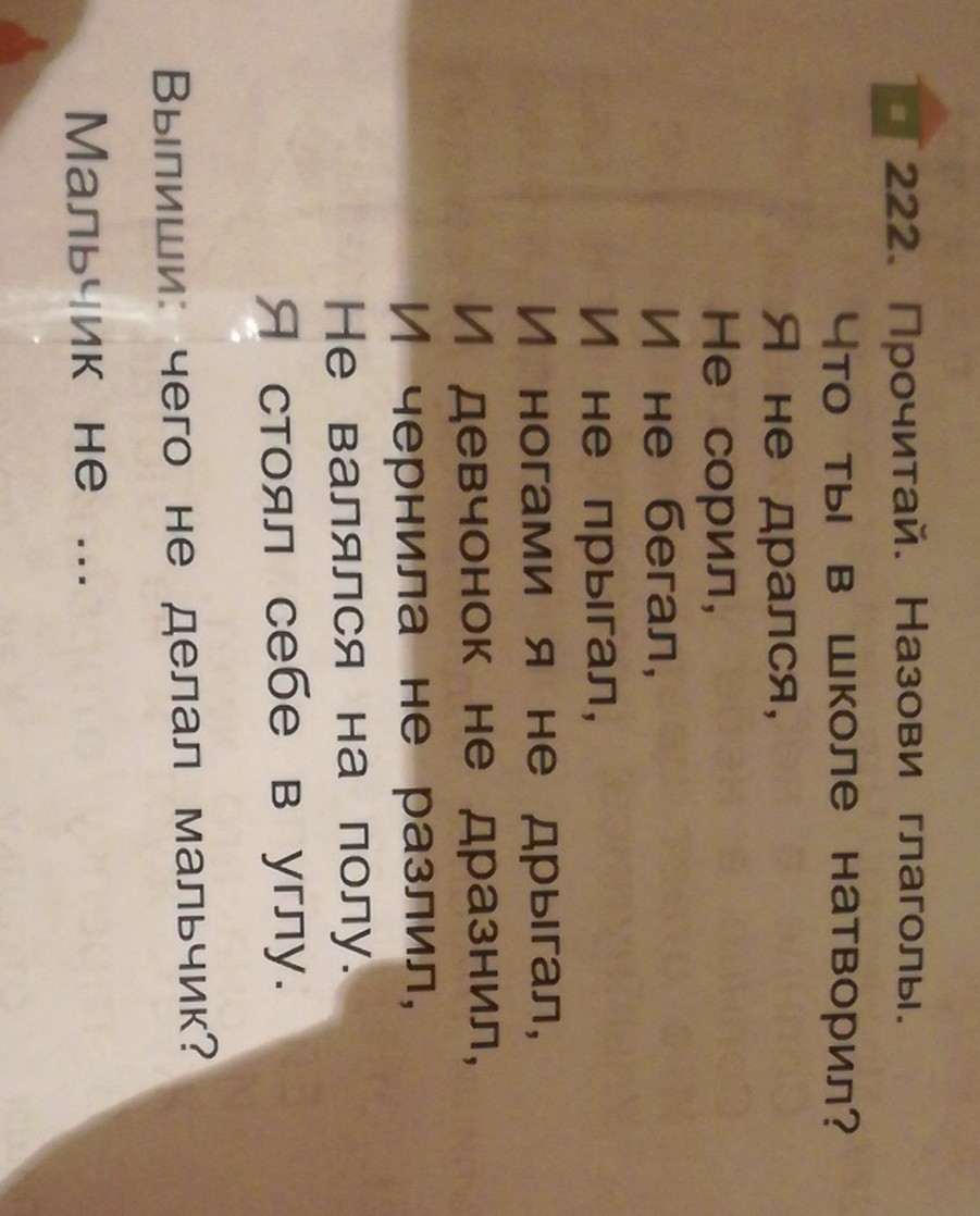 натворил, не дрался, не сорил, не бегал, не прыгал, не дрыгал, не дразнил, не разлил, не валялся, стоял