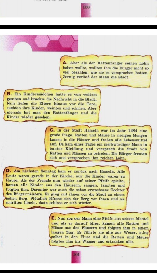 1-C В городе Хамельн в 1284 году было одно мучение ( чума). Крысы и мыши в огромных количествах пришли в дома и сожрали все продукты. Однажды пришел странный человек в пестрой одежде и пообещал город от крыс и мышей освободить. Жители обрадовались и пообещали ему богатое вознаграждение.