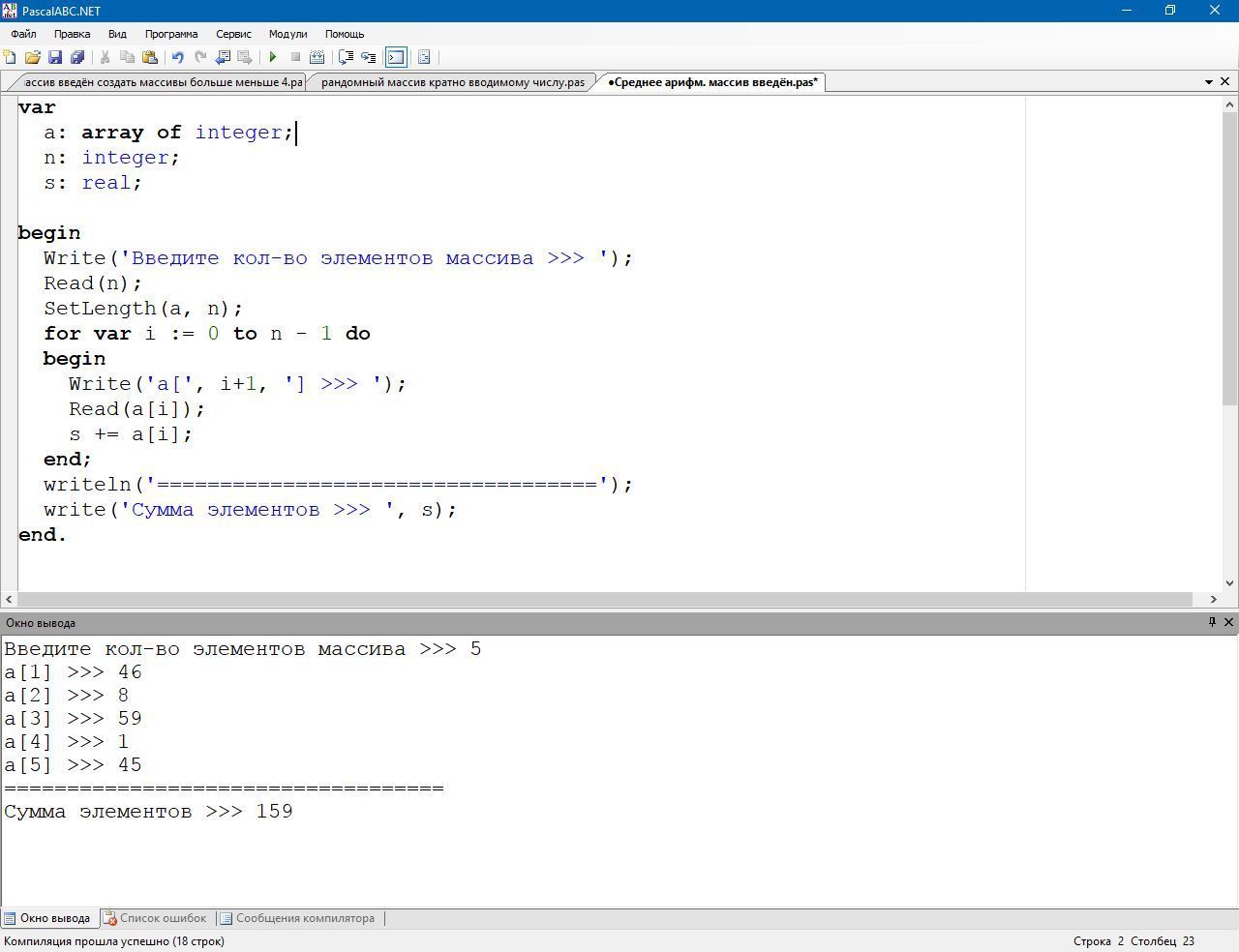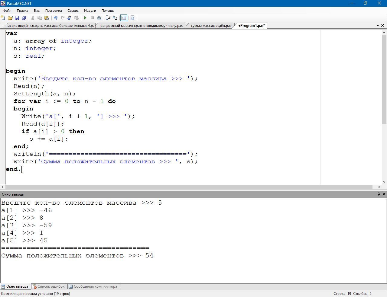 1)Вычислите сумму элементов массива.Элементы массива вводятся с клавиатуры.(46,8,59,1,45) 2)Напишем программу,которая вычисляет сумму положительных элементов в массиве. Элементы массива водятся с клавиатуры.(-46,8,-59,1,45)