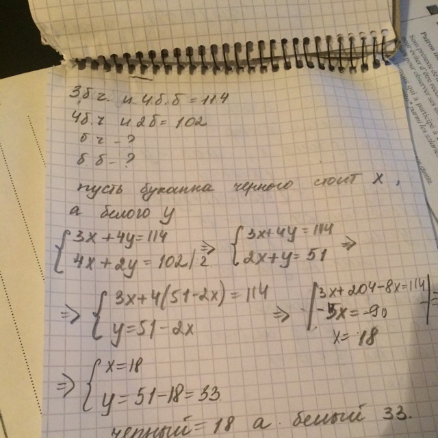 1)Три буханки черного хлеба и четыре батона белого хлеба стоят 114 руб .а четыре буханки и два батона стоят 102 рубля. Сколько стоит буханка черного и белого хлеба?