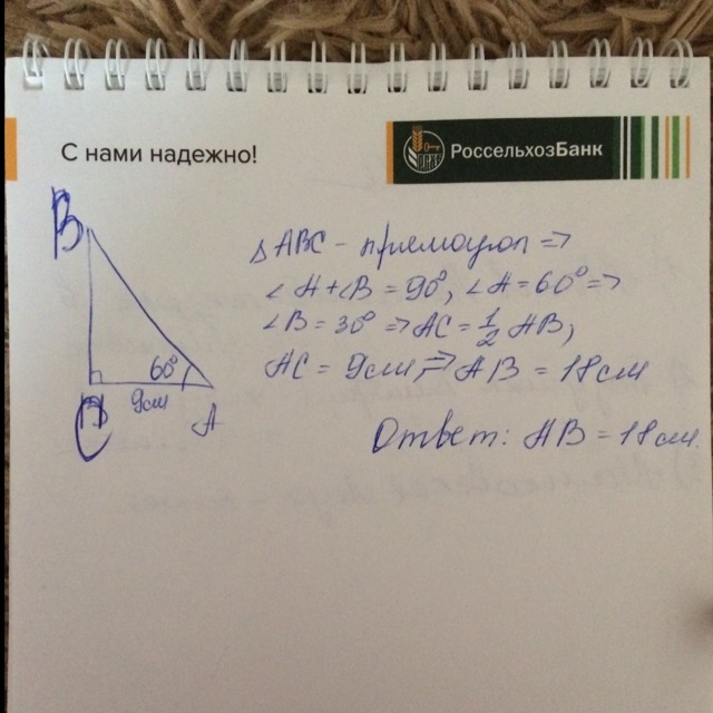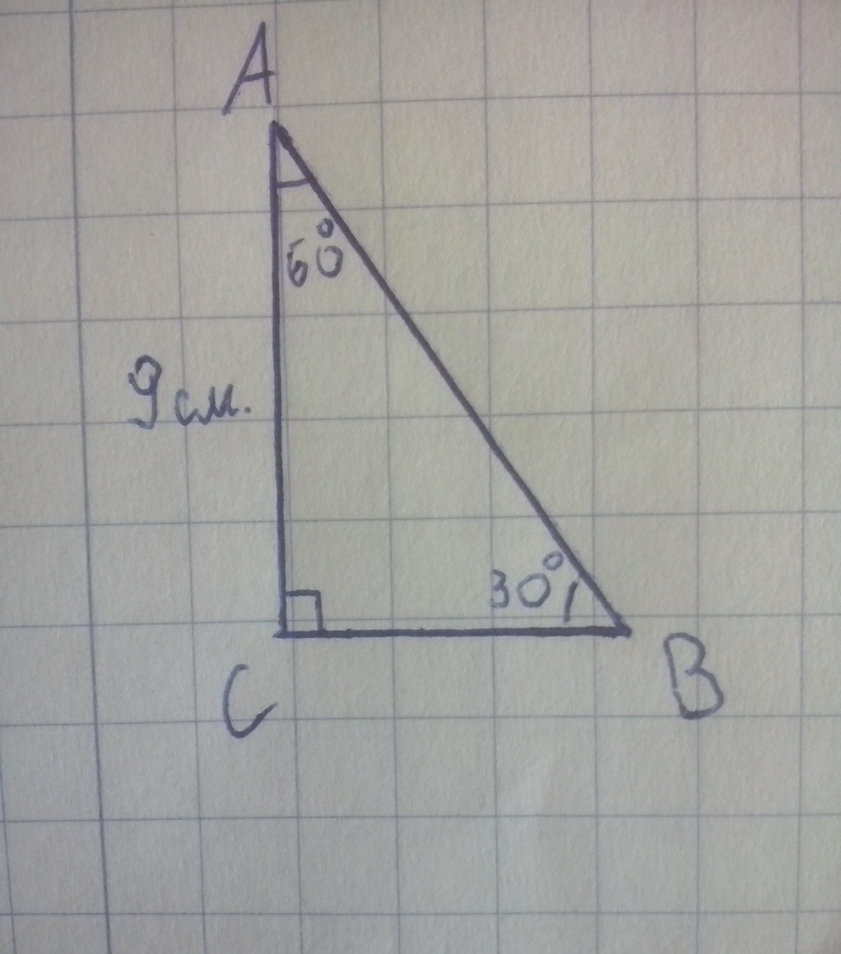 В прямоугольном треугольнике АВС (<С=90°) угол А равен 60°,катет АС=9см. Надите длину гипотенузы (с рисунком пожалуйста)