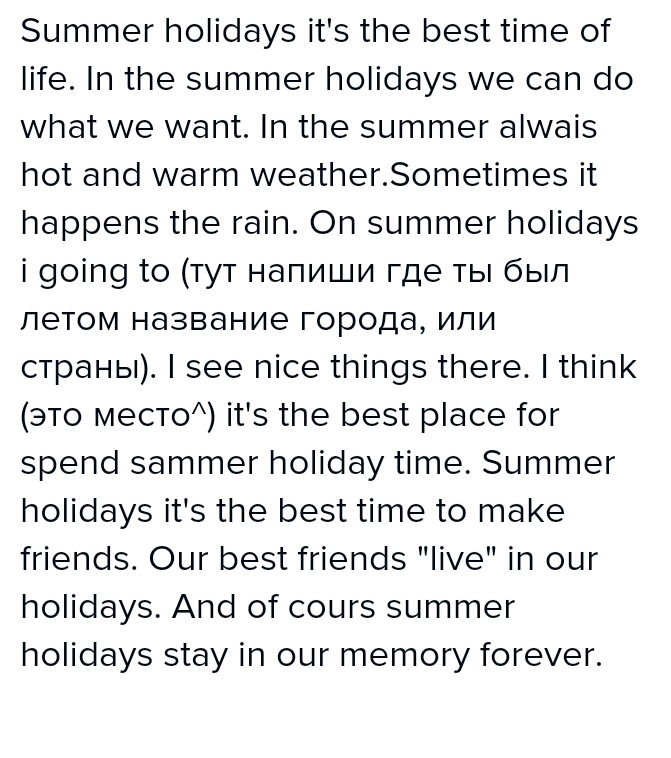Я хочу вам рассказать о моих летних каникулах. Я ездила в деревню к моей бабушке. Это было интересное место, и каждый день было тепло. Я ездила вдеревню со своей семьей. Мы ездили туда на поезде. Когда я приехала, я встретила своих старых друзей.