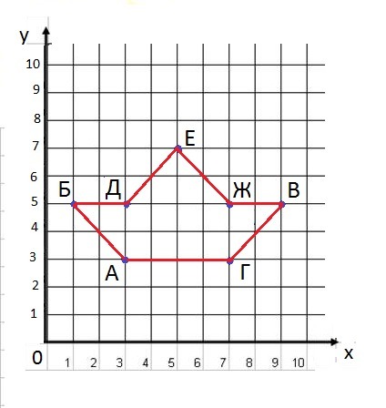 Б(1,5), В(9,5), Г(7,3), Д(3,5), Е(5,7), Ж(7,5), . Соедините точки: А-Б-Д-Е-Ж-В-Г-А.