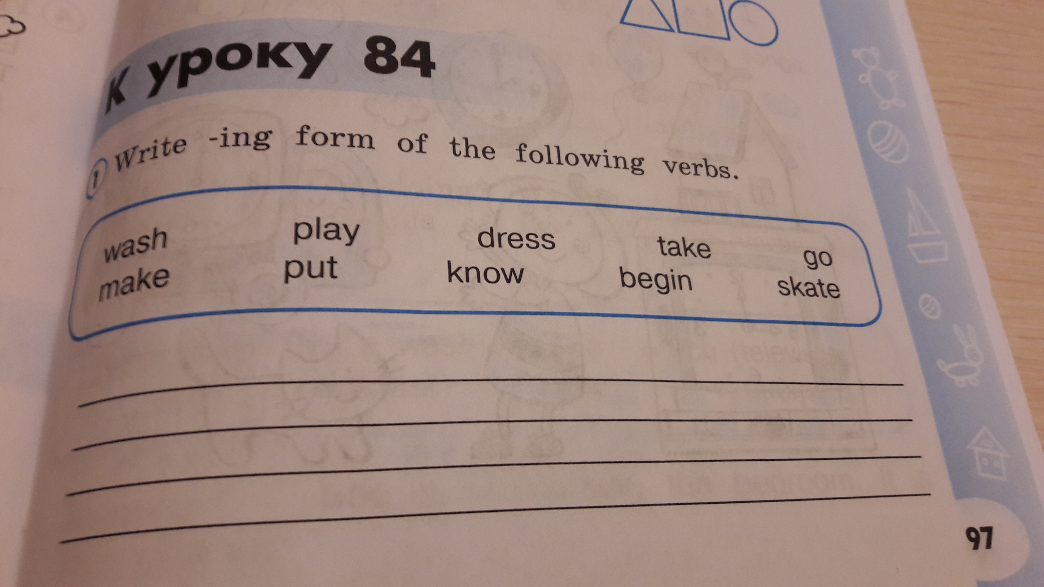 washing, playing, dressing, taking, going, making,puting, knowing, begining,skating