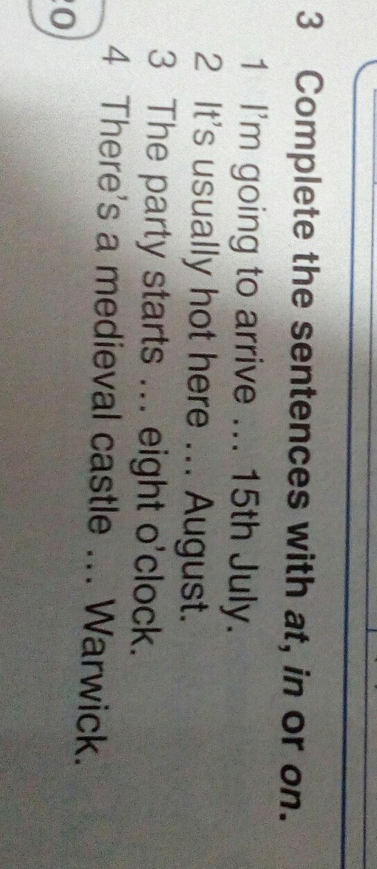 1.On 15th July.2.In August.3.At eight o'clock.4.On Warwick.