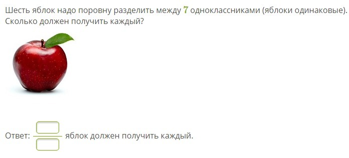 каждое яблоко делим на 7 частей, получается 7*5=35, теперь эти части делим на 7 детей 35:7=5 частей ⇒ каждый ребёнок получит по 5/7 яблока