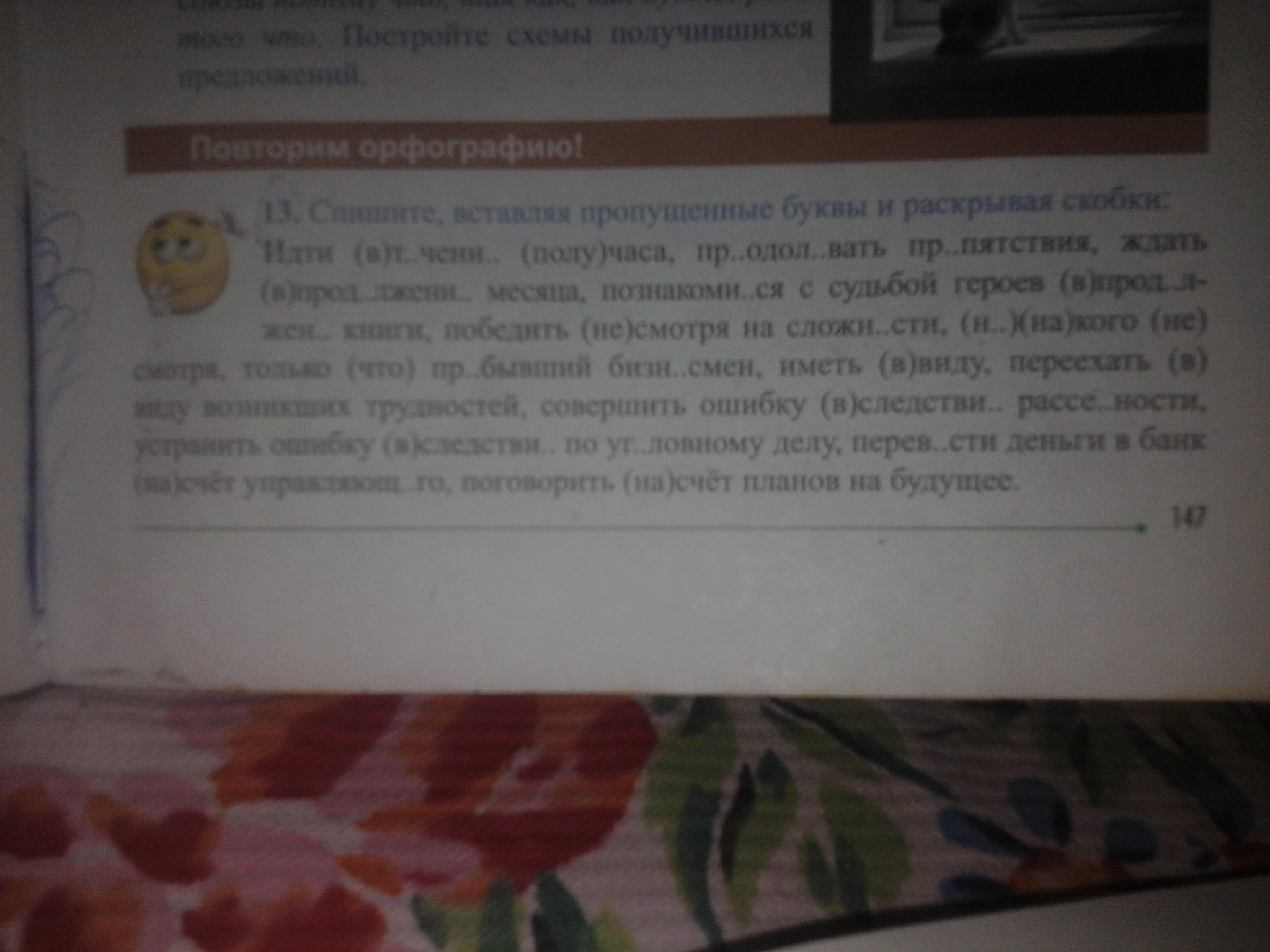 Идти в течение получаса; преодолевать препятствия; ждать в продолжение месяца; познакомиться с судьбой героев в продолжении книги; победить, несмотря на сложности; ни на кого не смотря; только что прибывший бизнесмен; иметь в виду; переехать ввиду возникших трудностей; совершить ошибку вследствие рассеянности; устранить ошибку в следствии по уголовному делу; перевести деньги в банк на счёт управляющего; поговорить насчёт планов на будущее.