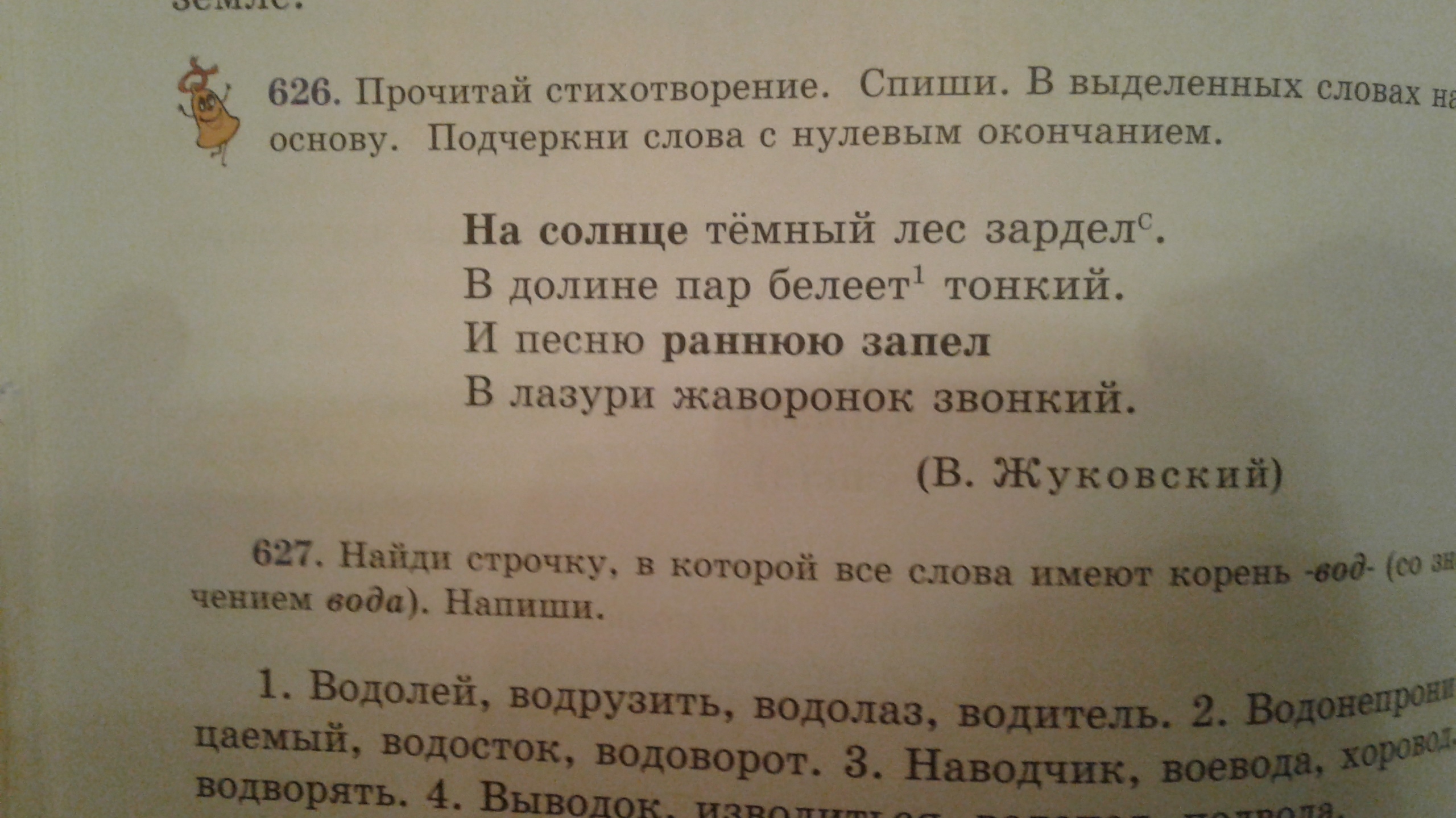 Прочитай стихотворение.Спиши.В выделенных словах найди основу.Подчеркни слова с нулевым окончанием.