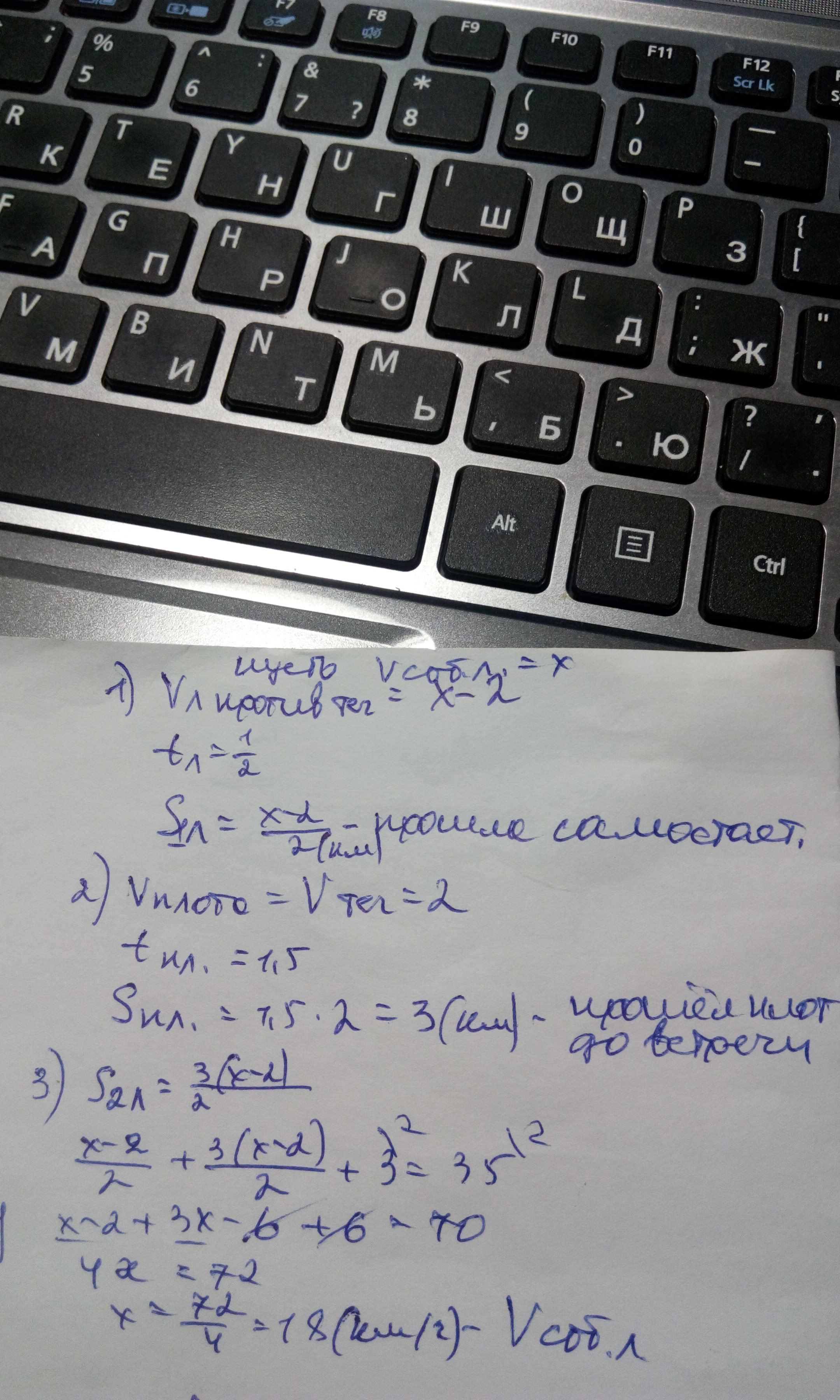 из пункта А вверх по течению к пункту В, расстояние до которого от пункта А равна 35 км, вышла моторная лодка. Через 0,5ч навстречу ей из пункта В отплыл плот и встретил моторную лодку через 1,5ч после своего отправления. Найдите собственную скорость лодки, если скорость течения реки 2 км/ч