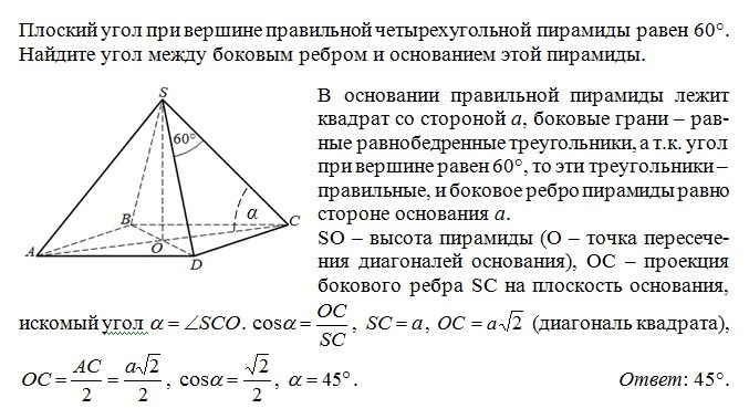 Плоский угол при вершине правильной четырехугольной пирамиды равен 60 градусов. Найдите угол между боковым ребром и основанием этой пирамиды.