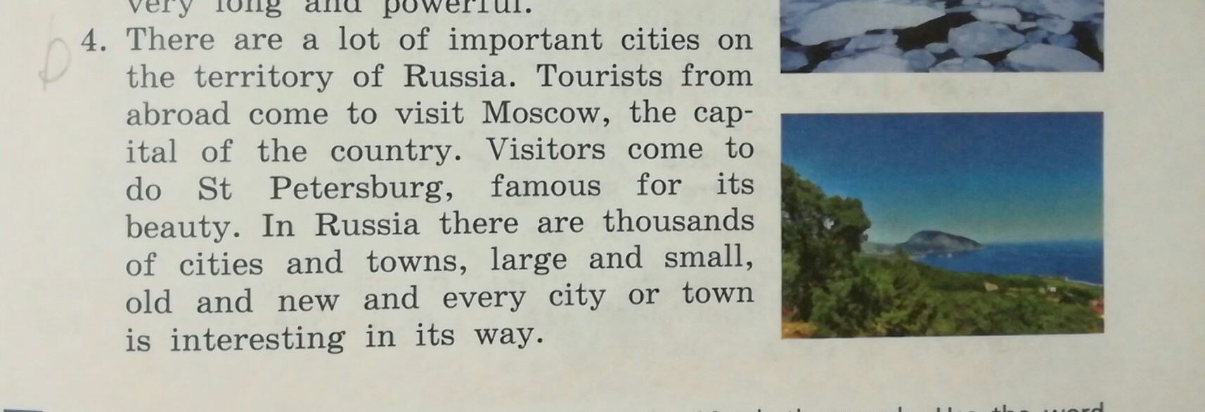 Есть много важных городов на територии России. Туристы из зарубежа приезжают и посещают Москву, столицу России. Посетители приезжают в Санкт-Питербург, известный его красотой. В России тысячи городов и городишек, больших и маленьких, старых и новых и каждый город или городок интересный по-своему