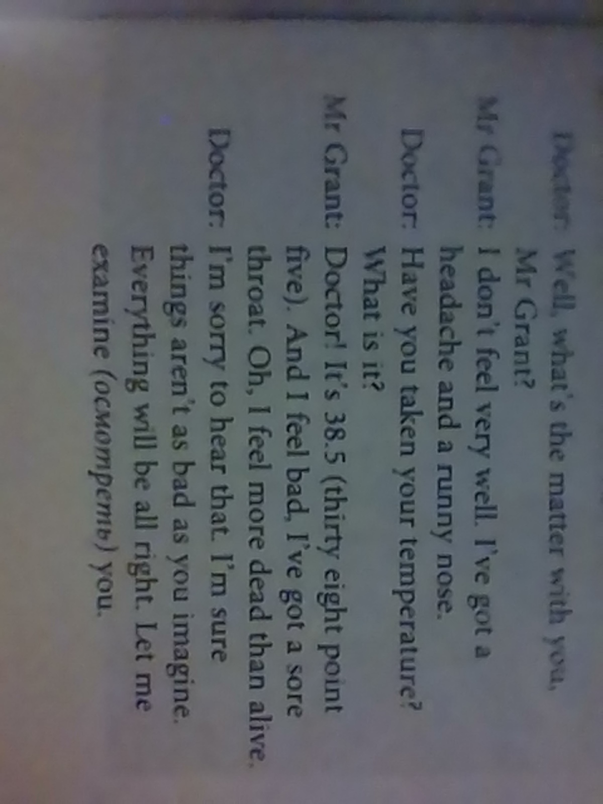 2.Доктор!У меня температура 38.5.И я чувствую себя плохо,у меня больное горло.Ох,я чувствую себя скорее мертвым,чем живым.
