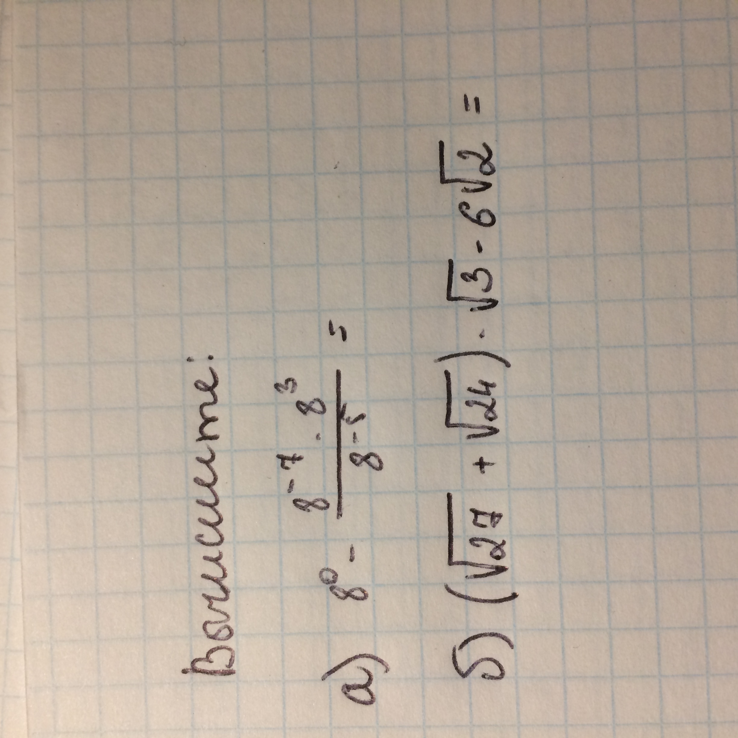 8^0- frac{8^{-7}*8^3}{8^{-5}}=1-8^{-7+3-(-5)}=1-8^1=1-8=-7  \  \  \ ( sqrt{27}+ sqrt{24}  )* sqrt{3}-6 sqrt{2} = ( 3sqrt{3}+ 2sqrt{6}  )* sqrt{3}-6 sqrt{2} = \ =9+2 sqrt{18}-6 sqrt{2}=9+6 sqrt{2}-6 sqrt{2}= 9